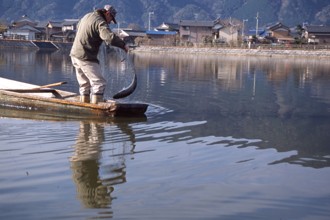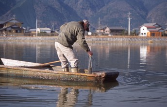 正月のご馳走・寒鮒漁 / 船,人,長靴,靴,帽子,魚,網,建物,山,植物,川,電柱