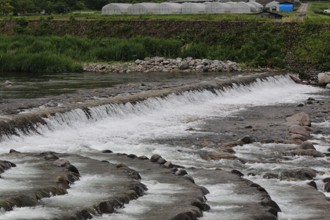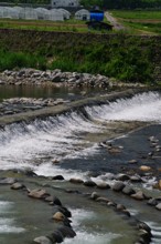 / 川,岩石,植物,河畔植生,ビニールハウス,建物,道,電柱