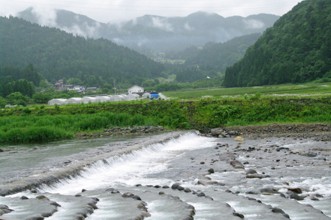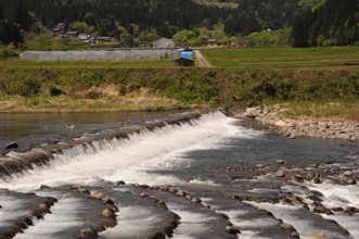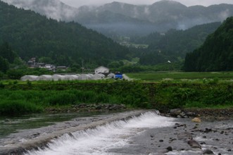 / 川,岩石,植物,河畔植生,木,山,空,雲,建物,ビニールハウス,電柱,道