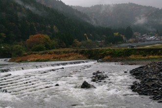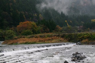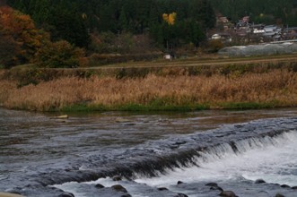 / 川,岩石,植物,河畔植生,木,山,建物,紅葉,電柱,建物,ビニールハウス