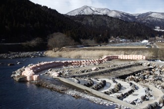 / 川,岩石,河畔植生,植物,木,山,雪,空,雲,電線,電柱,道,ビニールハウス,土嚢,建物,ガードレール