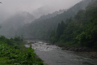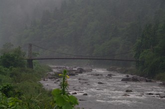 / 川,岩石,植物,河畔植生,木,植物,花,橋,山,霧