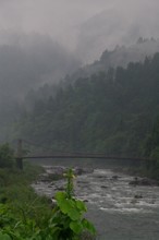 / 川,岩石,植物,河畔植生,木,植物,橋,山,霧