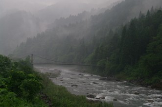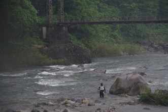 / 川,岩石,植物,河畔植生,木,植物,橋,山,人,網,釣り竿