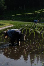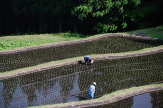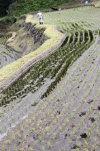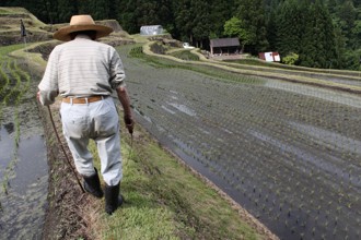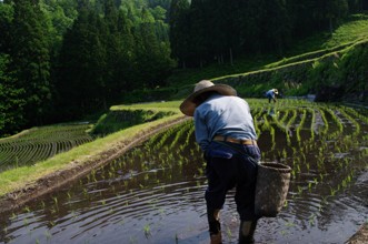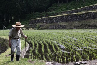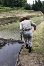/ 植物,木,水田,石垣,人,帽子,長靴,鎌,農機具