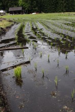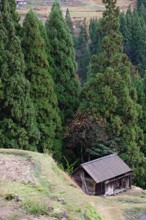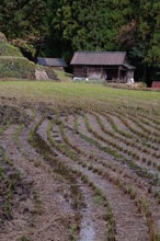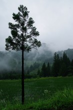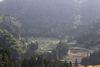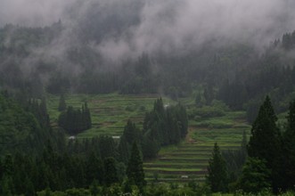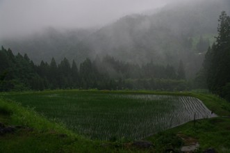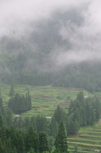 / 水田,植物,木,山,空,霧,棚田,建物,ビニールハウス