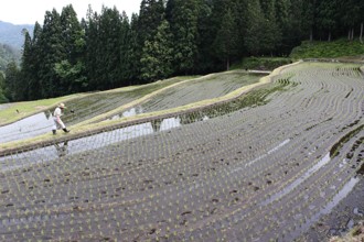 / 水田,植物,木,空,人,帽子,長靴,農機具,鎌,石垣,空