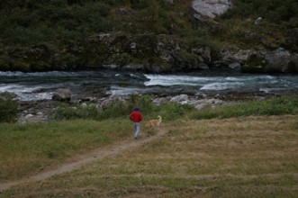 / 川,岩石,植物,河畔植生,人,帽子,犬