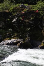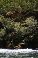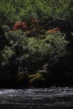 / 川,岩石,植物,河畔植生,しぶき,花,ツツジ