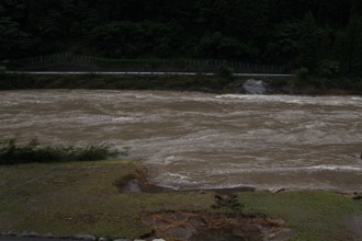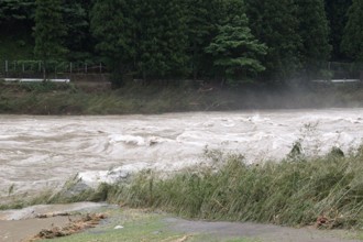 / 川,植物,河畔植生,柵,ガードレール,岩石,しぶき,木