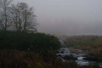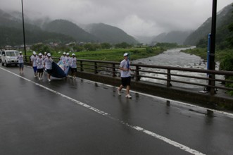 / 道路,人,帽子,たすき,靴,旗,車,パトカー,植物,河畔植生,木,川,岩石,電柱,電線,鉄塔,建物,山,橋,空,霧