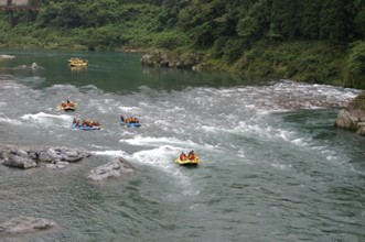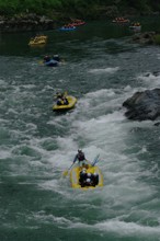 / 川,岩石,しぶき,船,帽子,救命胴衣,植物,河畔植生,オール,人,ヘルメット