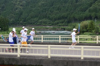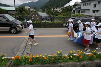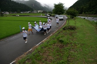 / 道路,人,帽子,たすき,靴,旗,車,パトカー,水田,植物,河畔植生,木,川,岩石,橋,電柱,電線,鉄塔,建物,山,