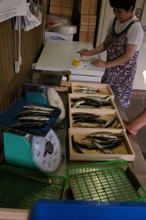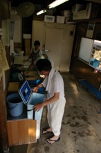 / 建物,人,クーラーボックス,サンダル,魚,はかり,ベンチ,バケツ,扇風機,発泡スチロールペン,タオル