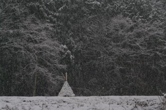 / 建物,雪,ウマ,馬,植物,木,電線,空
