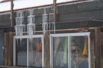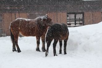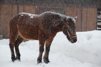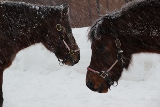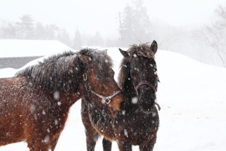 / ウマ,馬,建物,雪,人,笠,手袋,長靴,柵
