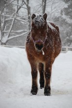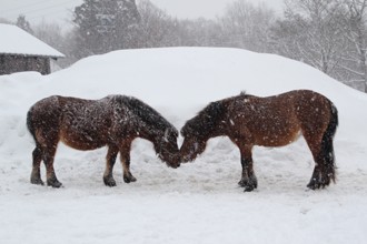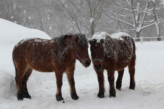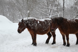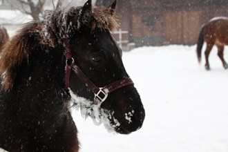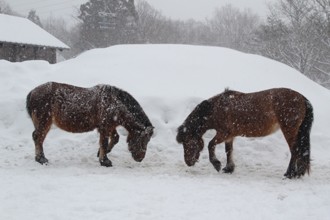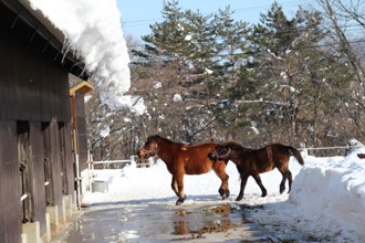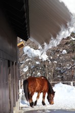 / 馬,ウマ,建物,雪,植物,木,電線,電柱,空