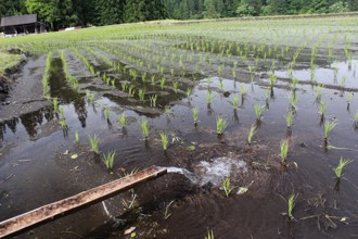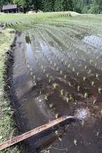 / 水田,植物,木,水路,人,笠,長靴,建物