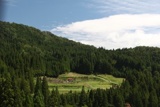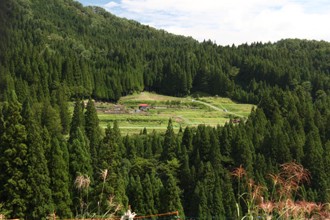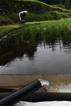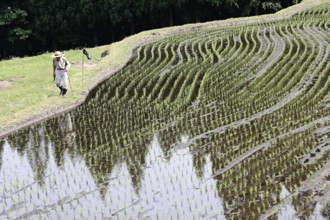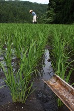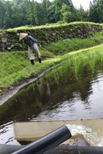 / 水田,植物,木,水路,石垣,人,長靴,笠,空