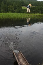 / 川,植物,河畔植生,人,笠,長靴