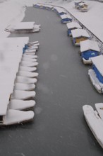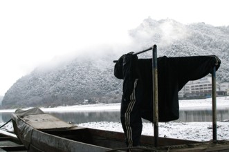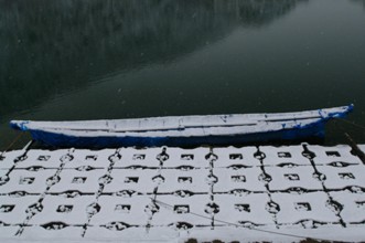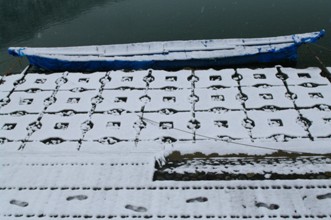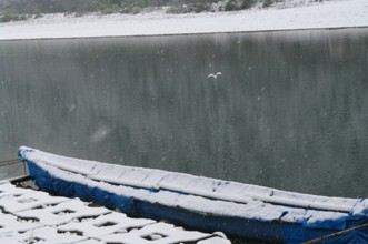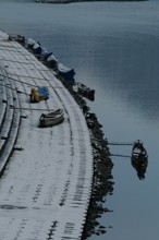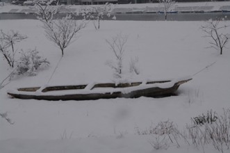 / 川,船,ブルーシート,鳥,鷺,サギ,植物,雪