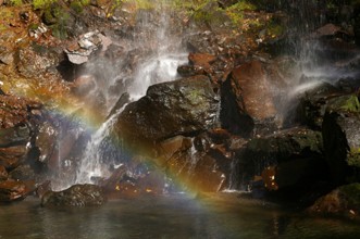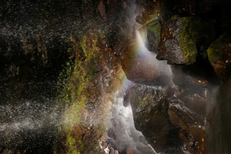 / 川,岩石,河畔植生,植物,滝,水しぶき,虹,コケ
