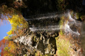 / 川,岩石,河畔植生,植物,滝,水しぶき,虹,紅葉,青空