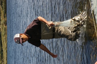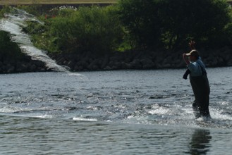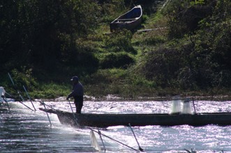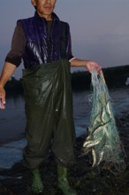 / 人,胴長,帽子,サングラス,川,網,魚,植物,河畔植生