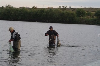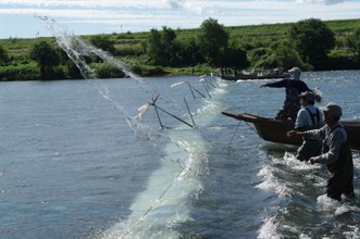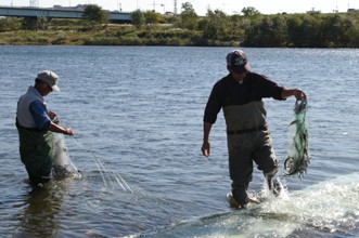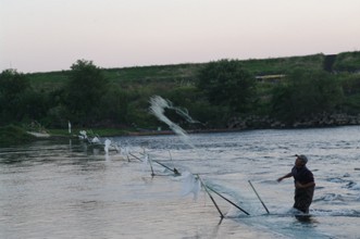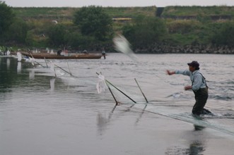 / 人,帽子,サングラス,網,魚,胴長,川,植物,鳥,鷺,サギ,木,河畔植生,建物,堤防,空