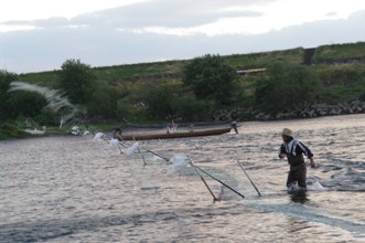 / 人,網,川,胴長,魚,アユ,鮎,堤防,空