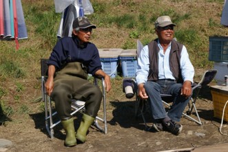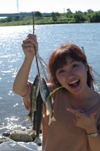 / 人,魚,鮎,アユ,川,植物,河畔植生,木,橋,鉄塔,電線,岩石,腕時計,笑顔
