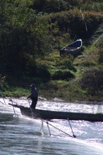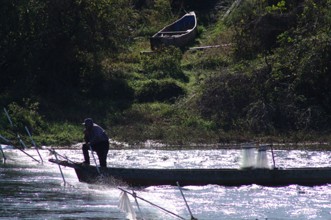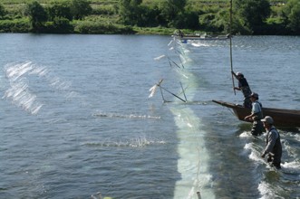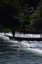 / 人,川,網,帽子,船,胴長,サングラス,植物,河畔植生,木
