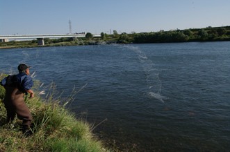 / 人,胴長,サングラス,帽子,網,魚,鮎,アユ,川,橋,鉄塔,外灯,植物