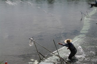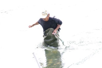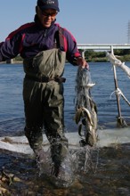 / 川,人,帽子,網,魚,胴長