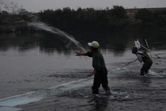 / 人,網,川,帽子,船,胴長