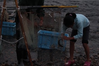 / 人,子供,胴長,サンダル,カゴ,網,魚,川,岩石