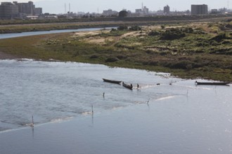 / 川,人,帽子,胴長,船,網,植物,河畔植生,堤防,木,空,建物,車