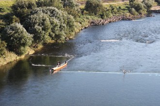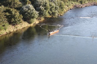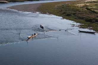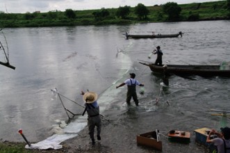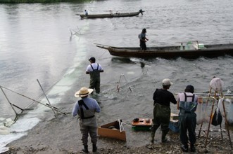 / 人,船,網,植物,木,河畔植生,川,帽子,胴長,消波ブロック