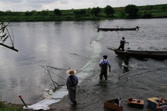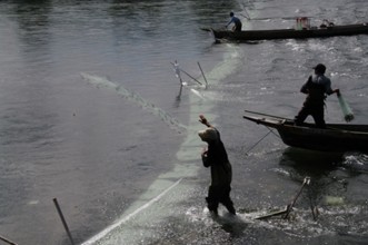 / 川,人,帽子,胴長,船,網,カゴ,植物