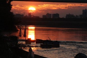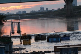 / カゴ,川,岩石,網,植物,河原,橋,建物,夕焼け,空,堤防