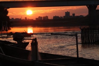 / 船,網,エンジン,川,堤防,建物,橋,夕日,太陽,夕焼け,空,植物,木,電柱,電線,車