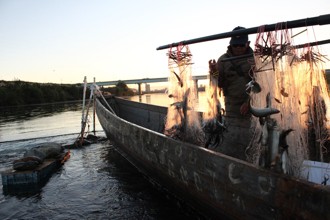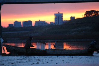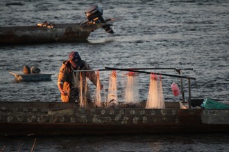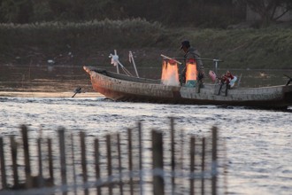 / 人,帽子,網,船,エンジン,川,植物,河畔植生,木,堤防,建物,空,夕焼け