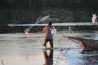 / 人,帽子,網,船,カゴ,岩石,川,堤防,植物,河畔植生,木,建物,空,夕焼け