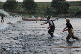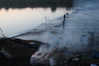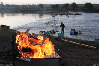 / 炎,木材,川,カゴ,網,人,帽子,胴長,船,植物,木,河畔植生,木,堤防,空,建物,岩石,エンジン