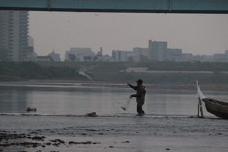 / 人,網,川,帽子,船,岩石,堤防,植物,河畔植生,橋,建物,空