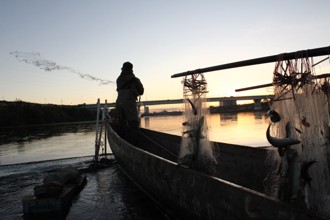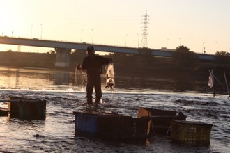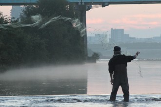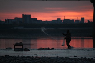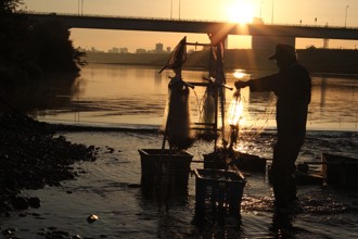 / 人,帽子,船,網,魚,カゴ,岩石,川,堤防,橋,空,夕焼け,建物,胴長