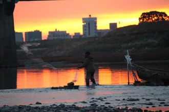/ 人,川,胴長,帽子,網,植物,河畔植生,木,建物,橋,堤防,空,夕焼け