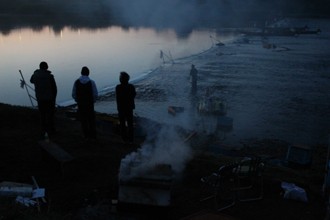 / 炎,木材,川,カゴ,網,人,帽子,胴長,船,植物,木,河畔植生,木,堤防,空,車,鉄塔,建物,岩石,エンジン