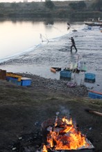 / ペットボトル,椅子,煙,カゴ,人,帽子,川,網,胴長,船,植物,河畔植生
