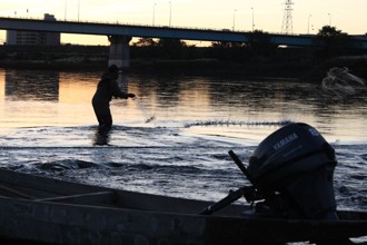 / 人,帽子,サングラス,船,網,魚,鮎,アユ,カゴ,岩石,橋,建物,植物,河畔植生,空,夕焼け,川